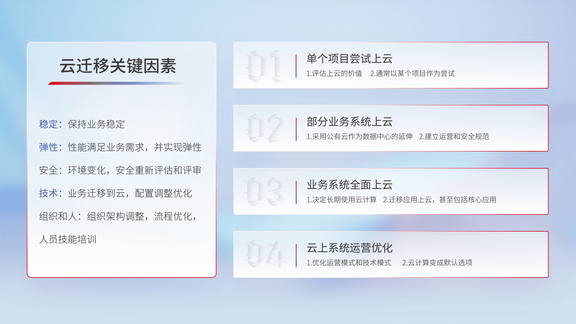 结合实际业务,,,从规划设计、、、、云平台选型、、、云原生改造、、、数据迁移、、集成交付,,迁移全过程为客户识别最佳上云路径,,,,做好风险识别管理,,,,设计网络架构、、、、身份权限、、、、安全审计合规、、、操作审计、、、、日志审计、、、监控告警策略、、、多站点容灾设计等,,,对云上基础设施进行整体规划,,提升IT治理水平,,,,以满足弹性、、、、高可用、、、、高性能的需求。。。