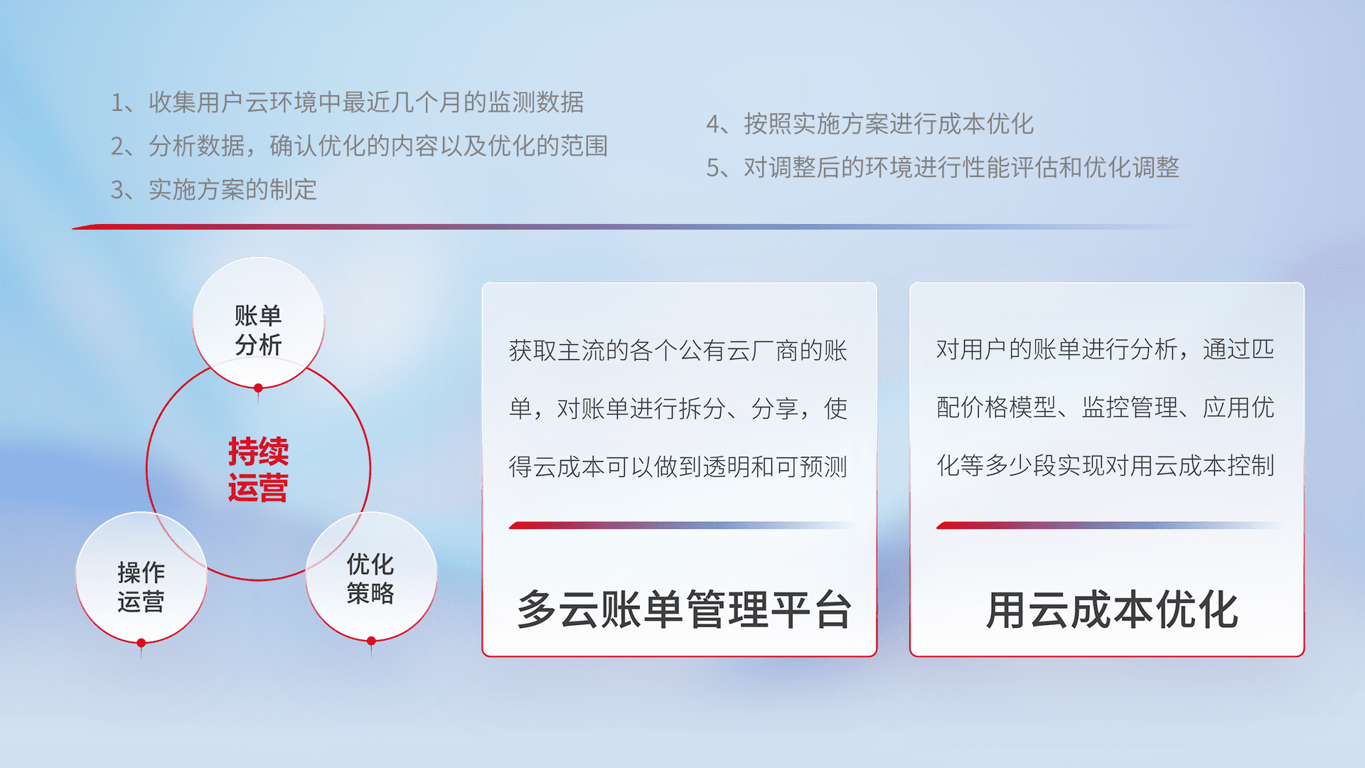 通过多云纳管,,,,以统一的资源数据模型把客户的云资源进行抽象和封装,,,进而实现对多云资源的统一操作,,保障云资源管理的可靠性、、、稳定性与可用性。。。量身定制化运维内容,,,,配置、、、、开发运维、、补丁管理、、、、备份、、、、监控、、、、认证和访问管理、、、、审计和日常巡检等,,,,保障在用云过程中的可靠度,,,,稳定度以及高可用率。。。